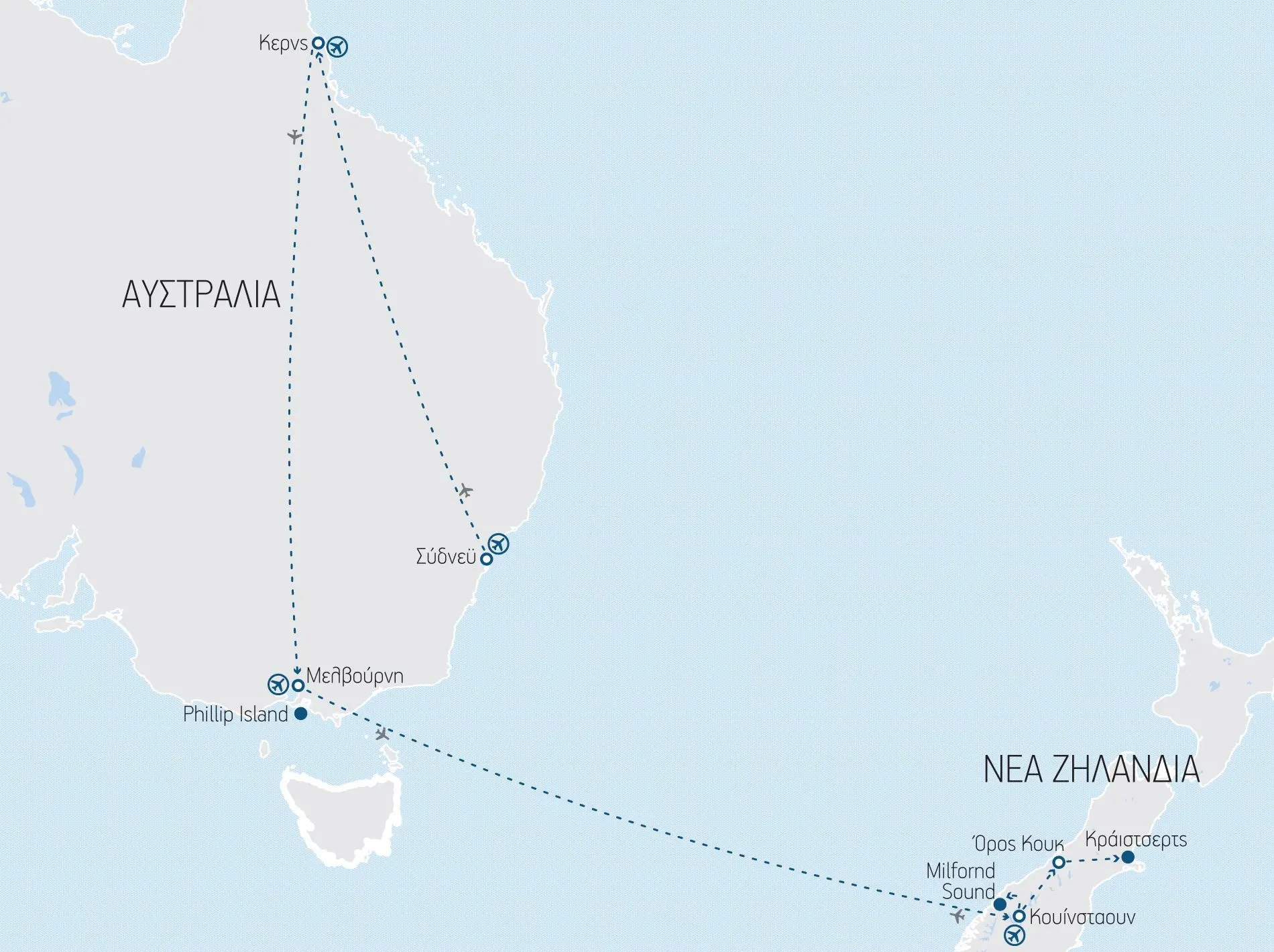 16 μέρες Μελβούρνη-Σίδνεϋ-Κέρνς-Μεγάλος Κοραλλιογενής Ύφαλος -Μπλε Όρη – Ωκεάνιος Δρόμος – Καταφύγιο άγριας ζωής στη νήσο Φίλιπ – Κουινστάουν – Ωκεάνια Φιορδ (Μίλφορντ Σάουντ) – Όρος Κουκ – Κράιστσέρτς. Διαμονή σε ξενεδοχεία 4* με 13 πρωινά & 4 γεύματα.